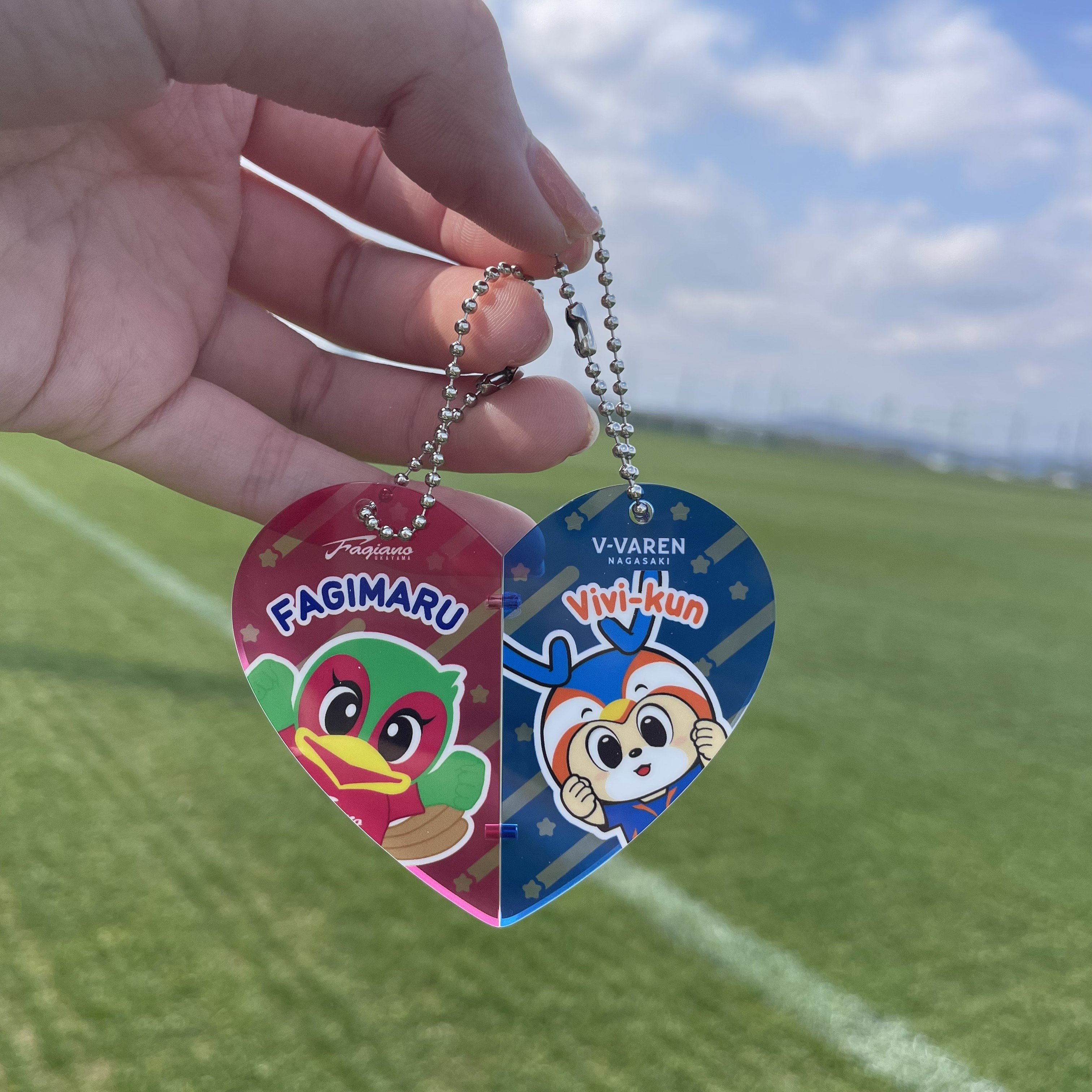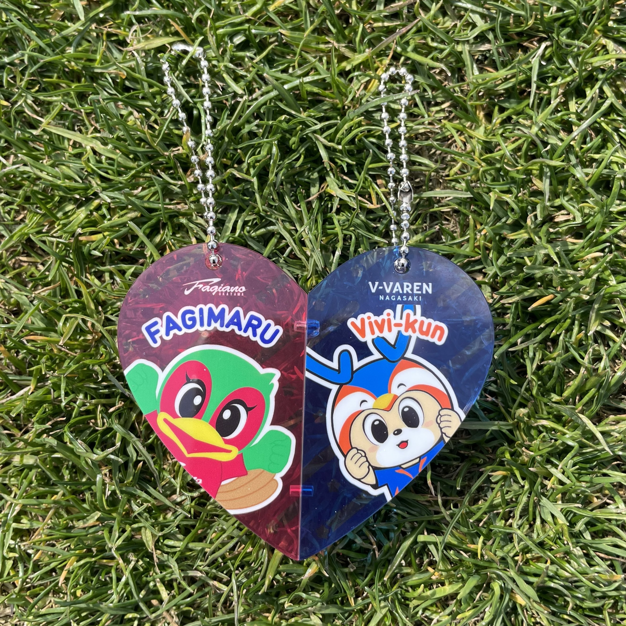 ファジ丸×ヴィヴィくんコラボ! キュートな2人がハートの中に♡ 2つのキーホルダーとしても成立しますし、くっつけた状態でニコイチデザインもお楽しみいただけます。 サイズ:約70×70㎜角内 素材:アクリル